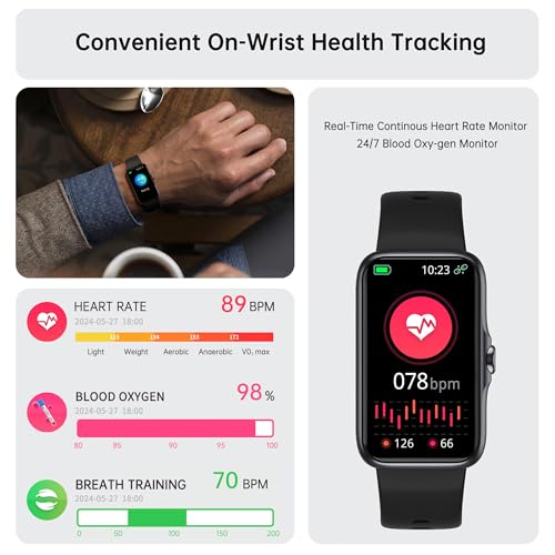 Auto Blood Oxygen&Sleep Monitor: Track your blood oxygen levels throughout the day and view detailed charts and trends in the app to better understand your health. The fitness watch also automatically monitors awake, light and deep sleep stages, helping you evaluate sleep quality and improve sleep habits.